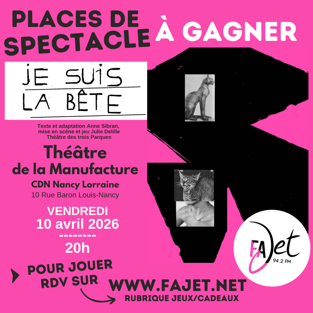 Gagnez 2 places pour la pièce "Je suis la bête" à Nancy le 10 avril. Participez vite à ce jeu exclusif organisé par Radio Fajet !