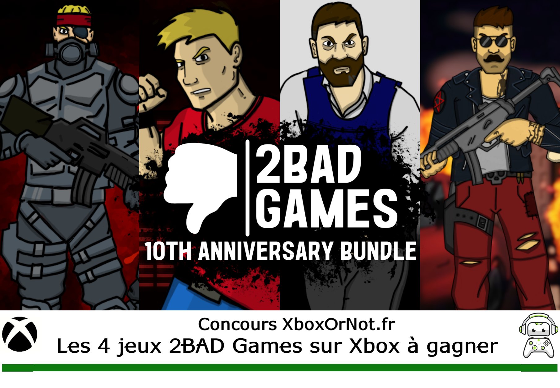 🎁 Nouveau CONCOURS 🎁 🎂Le studio 2BAD GAMES fête ses 10 ans! 🎮Pour l'occasion, on te fait gagner la compilation 2BAD GAMES – 10th Anniversary Bundle sur Xbox 👉Tu auras accès aux 4 jeux suivants : 3XTINCTION, BROKEN MIND, BRUTAL RAGE et 2URVIVE Pour participer : ➡️ Suivre