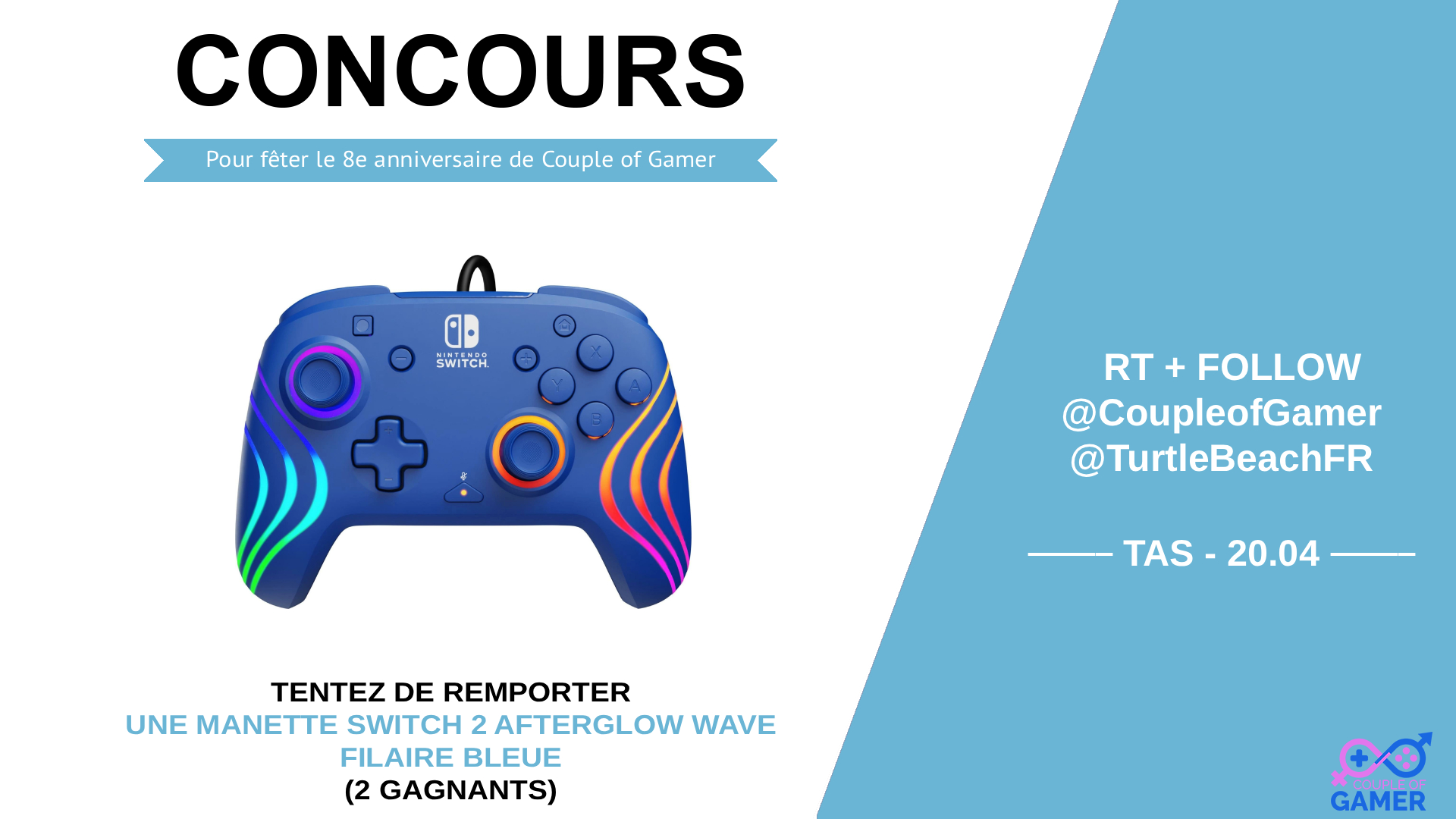 Nouveau #Concours pour les 8 ans du site ! Et pour cette nouvelle semaine, on vous fait gagner 2 Manettes Switch 2 Afterglow Wave filaire bleue Pour participer RT + Follow @CoupleOfGamer et @TurtleBeachFR TAS le 20/04 🍀Bonne chance à tous🍀 #CoG