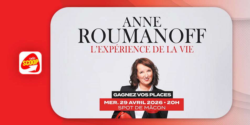 Cette semaine, Radio SCOOP vous offre vos places pour le spectacle "L'experience de la vie" d’Anne Roumanoff, au Spot de Mâcon, mercredi 29 avril 2026 à 20h.