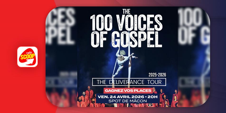 Cette semaine, Radio SCOOP vous offre vos places pour le concert "Gospel pour 100 voix", au Spot de Mâcon, vendredi 24 avril 2026 à 20h.