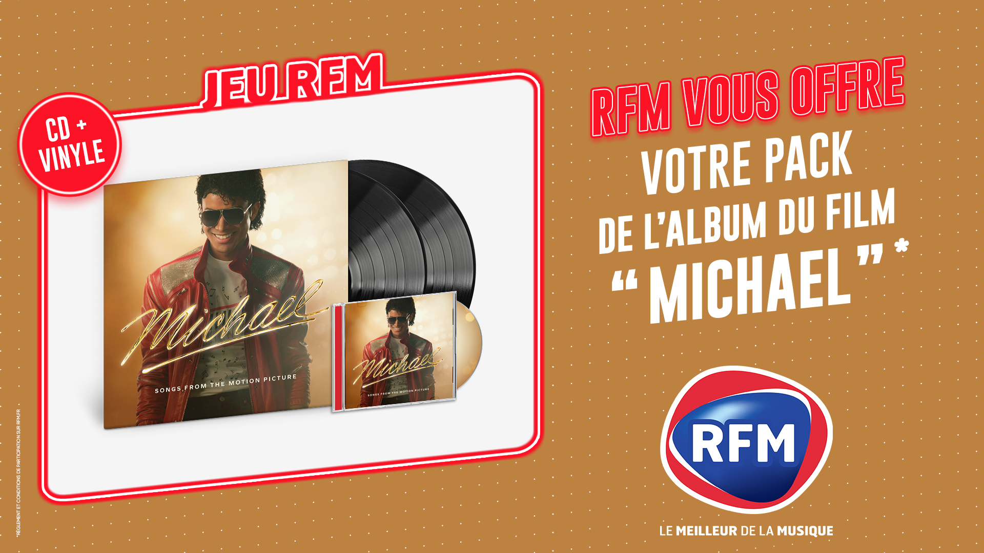 A l’occasion de la sortie du film Michael, RFM vous offre votre pack CD + vinyle de Michael Jackson. <br /> <br />