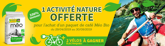 Du 29 avril au 30 septembre 2019, pour tout achat d'un paquet de café Méo Bio, vous pouvez demander directement en ligne sur Cafesmeo-activites.fr votre code pour profiter d'une activité nature offerte.