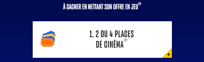 Si vous remettez votre Code Ciné en jeu, vous renoncez donc à l’offre promotionnelle mais jouez pour gagner 1, 2 ou 4 places de cinéma parmi 1 million mises en jeu: