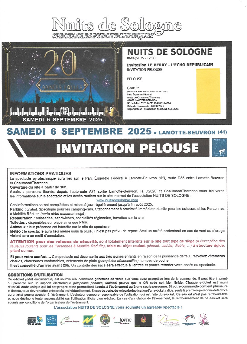 « Bonjour. J'ai reçu aujourd'hui une invitation au spectacle pyrotechnique "Nuits de Sologne". Concours LeBerry du 22/07/25 valeur 23€ !! Merci génie !! »
