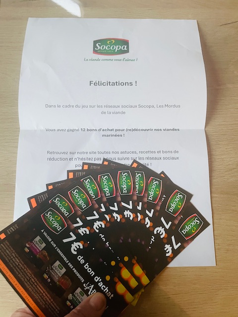 « Gagné 12 BA de 7 € sur Facebook. Merci à Socopa les mordus de la viande. »