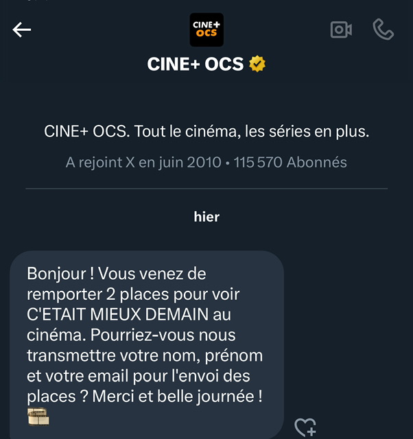 « Merci à Ciné + OCS pour ce gains de 2 places de cinéma.