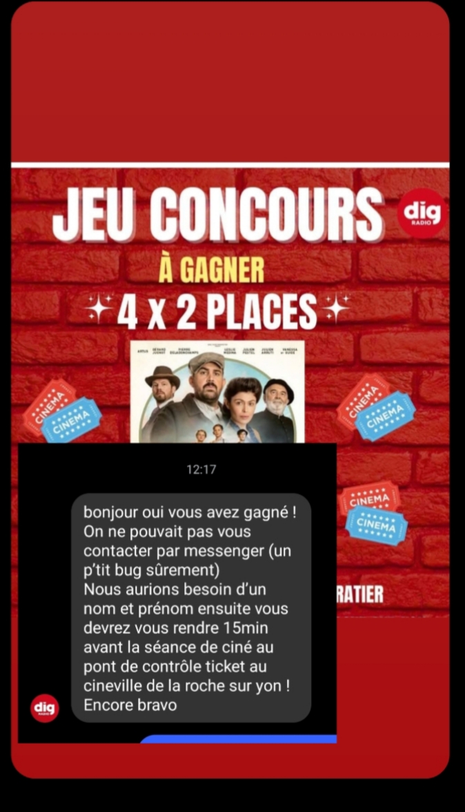 Gagné par Gertrude01 il y a 1 sem« Gagné avec Dig Radio 2 places de cinéma pour aller voir en avant-première "Les enfants de la résistance", merci beaucoup. »