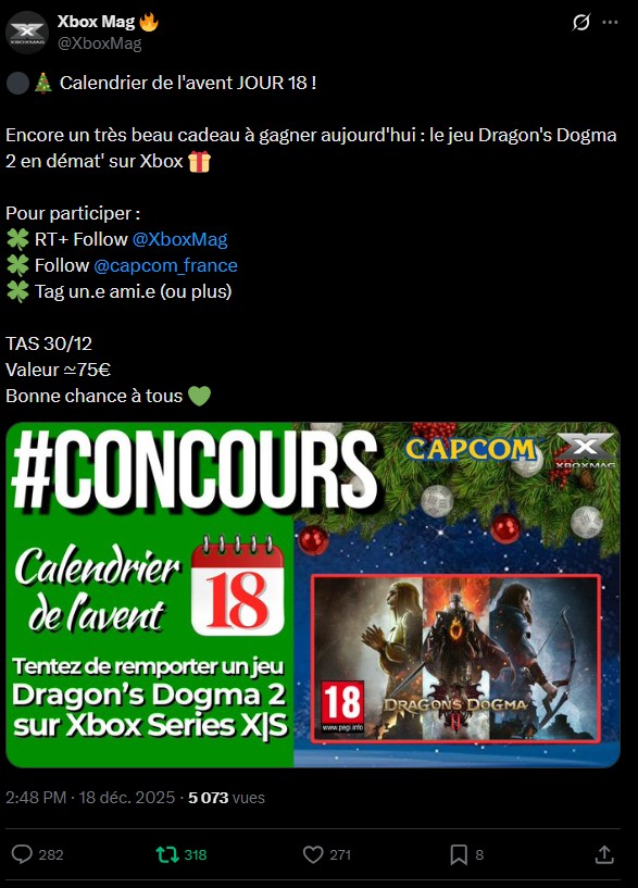 « Hello et félicitations, tu remportes notre lot de la case 18 de notre calendrier de l'avent (le jeu Dragon's Dogma 2 sur Xbox).
