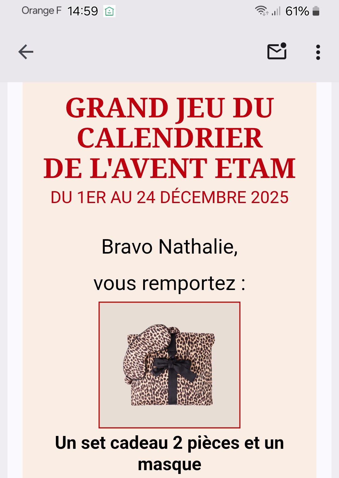 « Enfin un lot au calendrier de l avent ETAM. Très joli! Merci à ETAM et à notre génie »