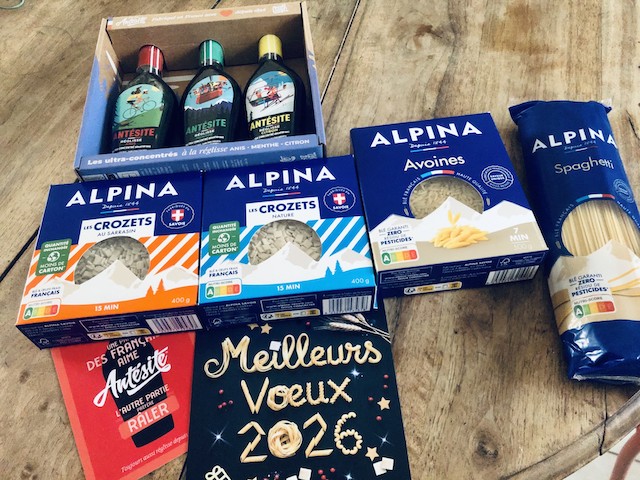 « Gagné le jour 16 sur la page Instagram de Alpina Savoie: 3 paquets de Crozet, 1 paquet de spaghettis, et un joli coffret d'Antésite, boisson à la réglisse qui me rappelle mon enfance.