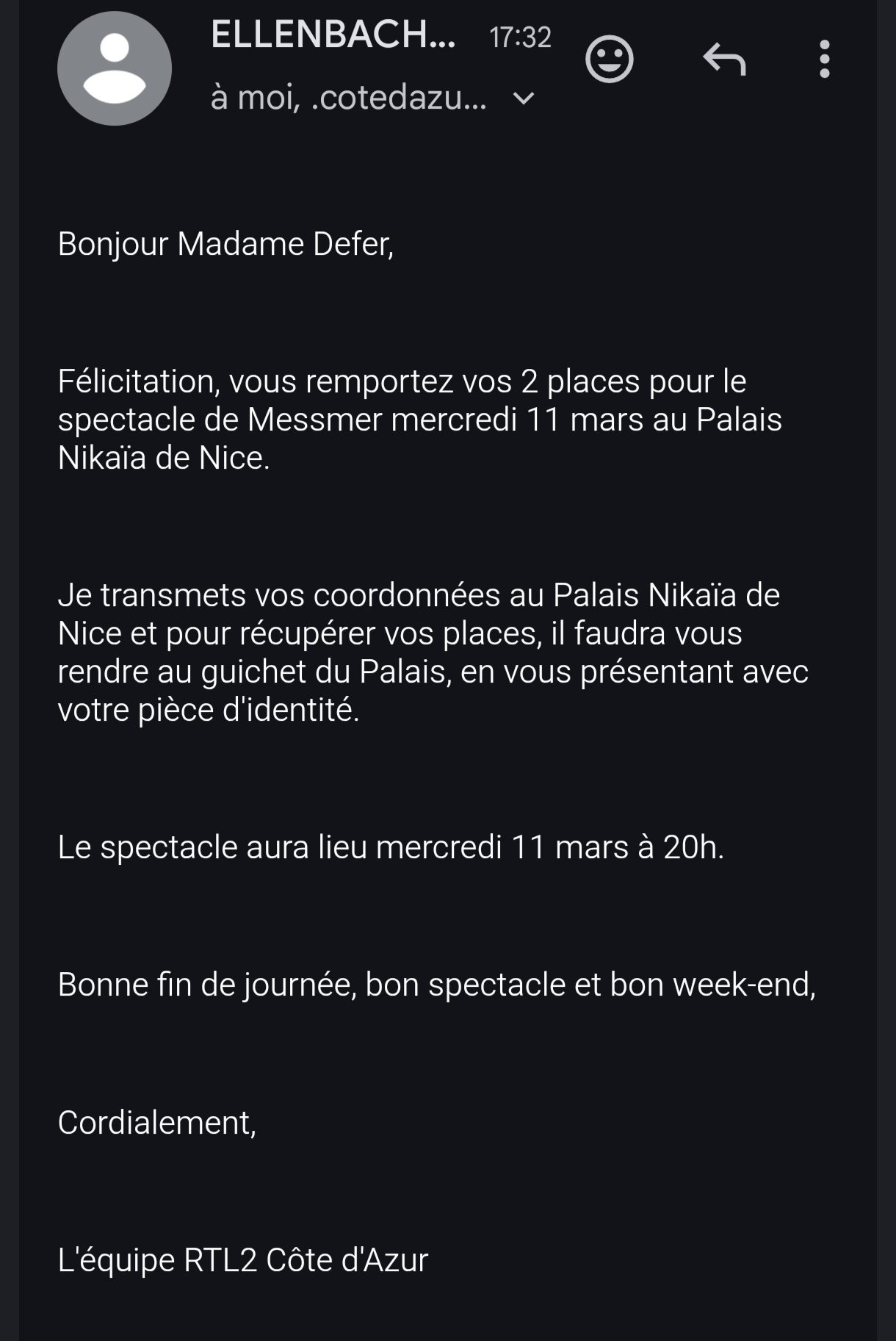 « Gagné à l'instant 2 places de spectacle de Messmer à Nice grâce à RTL2