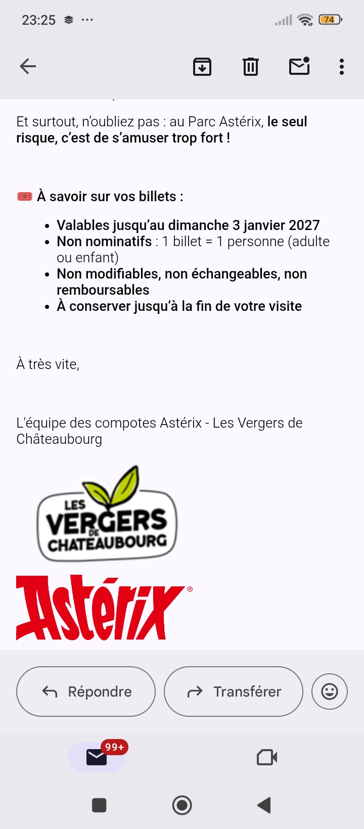 « J'ai gagné deux places pour le parc Astérix au jeu Instant gagnant. Je commence les jeux concours et du coup je n'arrête plus. Merci au Verger de Châteaubourg et au génie. »
