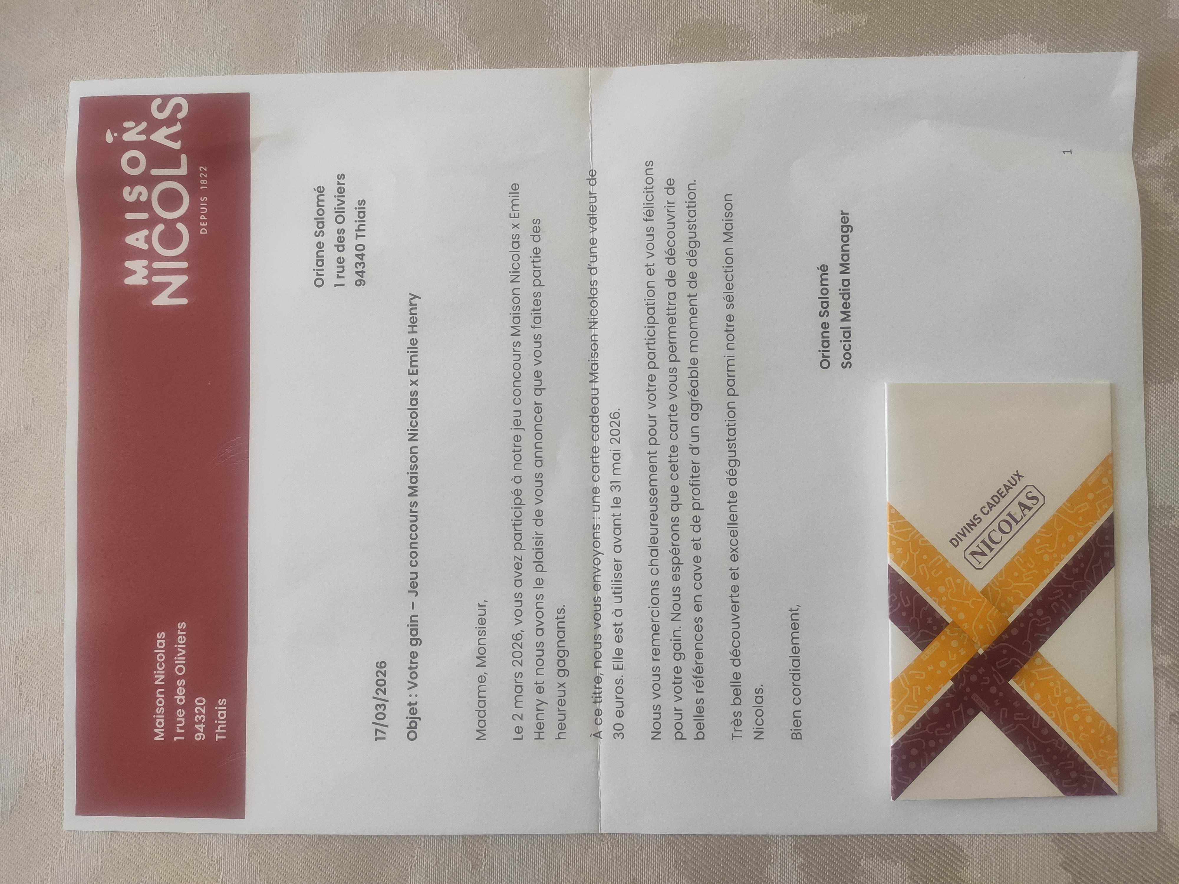 « J'ai gagné une carte cadeau de 30 €. Merci à Maison Nicolas et au Génie »