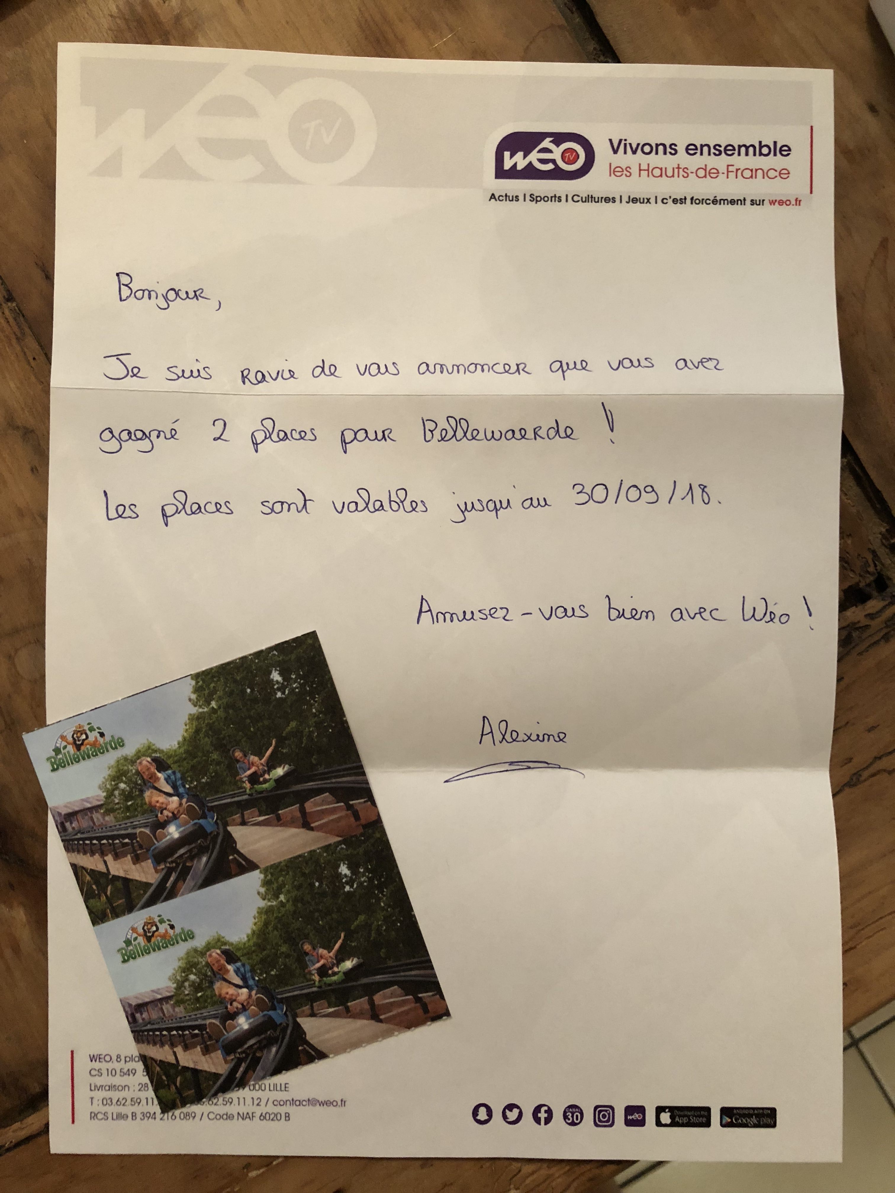 J'ai gagné 2 entrées pour Bellewaerde pour la rentrée ! Merci beaucoup ! »