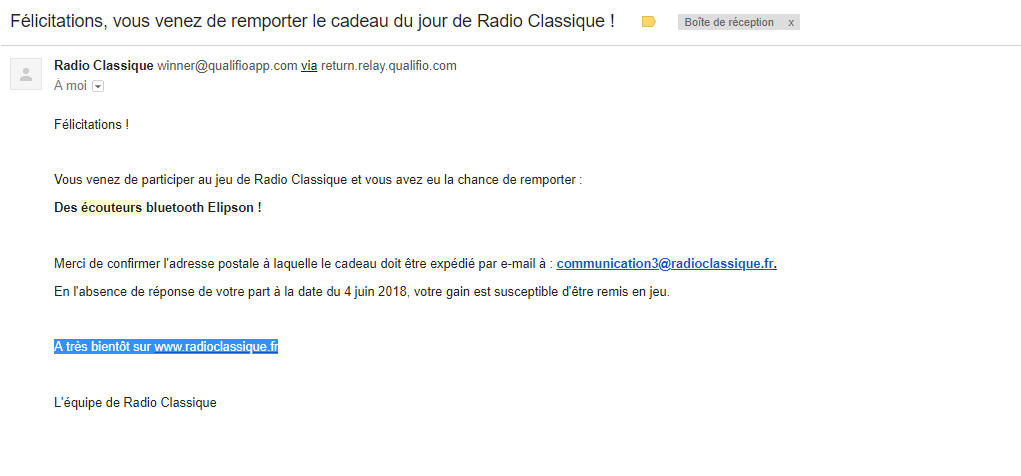 « Merci de m'avoir proposé ce concours car j'ai eu la belle surprise de recevoir mon colis lundi (sans avoir était prévenu que j'avais gagné) CA M'A FAIT PLAISIR.