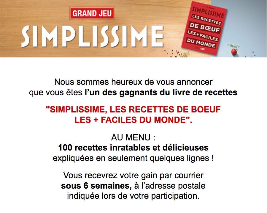 « Nous sommes heureux de vous annoncer que vous êtes l’un des gagnants du livre de recettes "SIMPLISSIME, les recettes de boeuf les + faciles du monde".