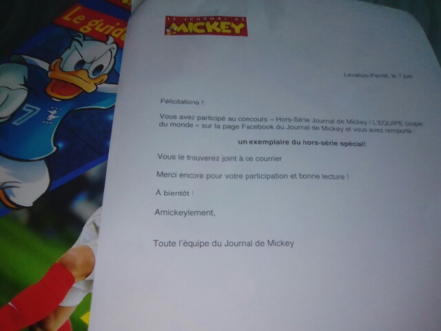 « Reçu aujourd'hui le livre "Escape au secours de Chi" gagné au concours Glénat du Journal de Mickey... Merci beaucoup aux organisateurs du concours et au Génie