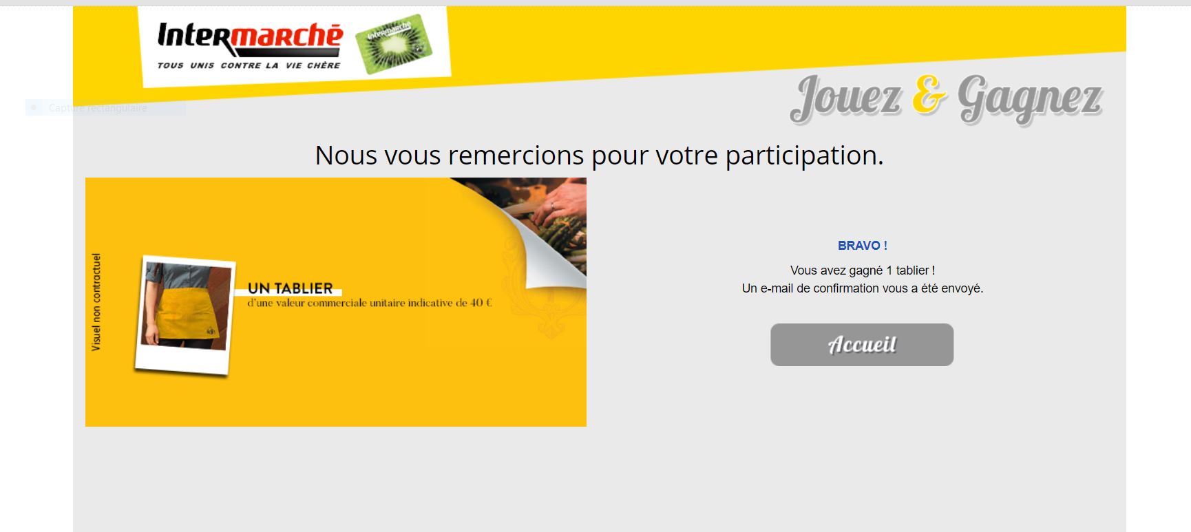 « Toute l'équipe INTERMARCHÉ et LEFFE vous félicite ! Vous avez gagné 1 tablier d'une valeur commerciale unitaire indicative de 40.00€.
