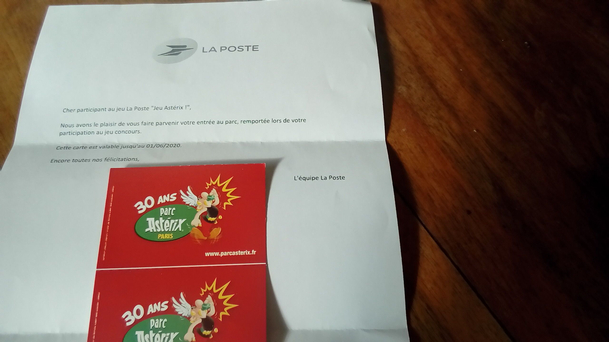 « Reçu ce jour les deux entrées pour le parc Astérix!!! Merci la poste et le Génie!! »