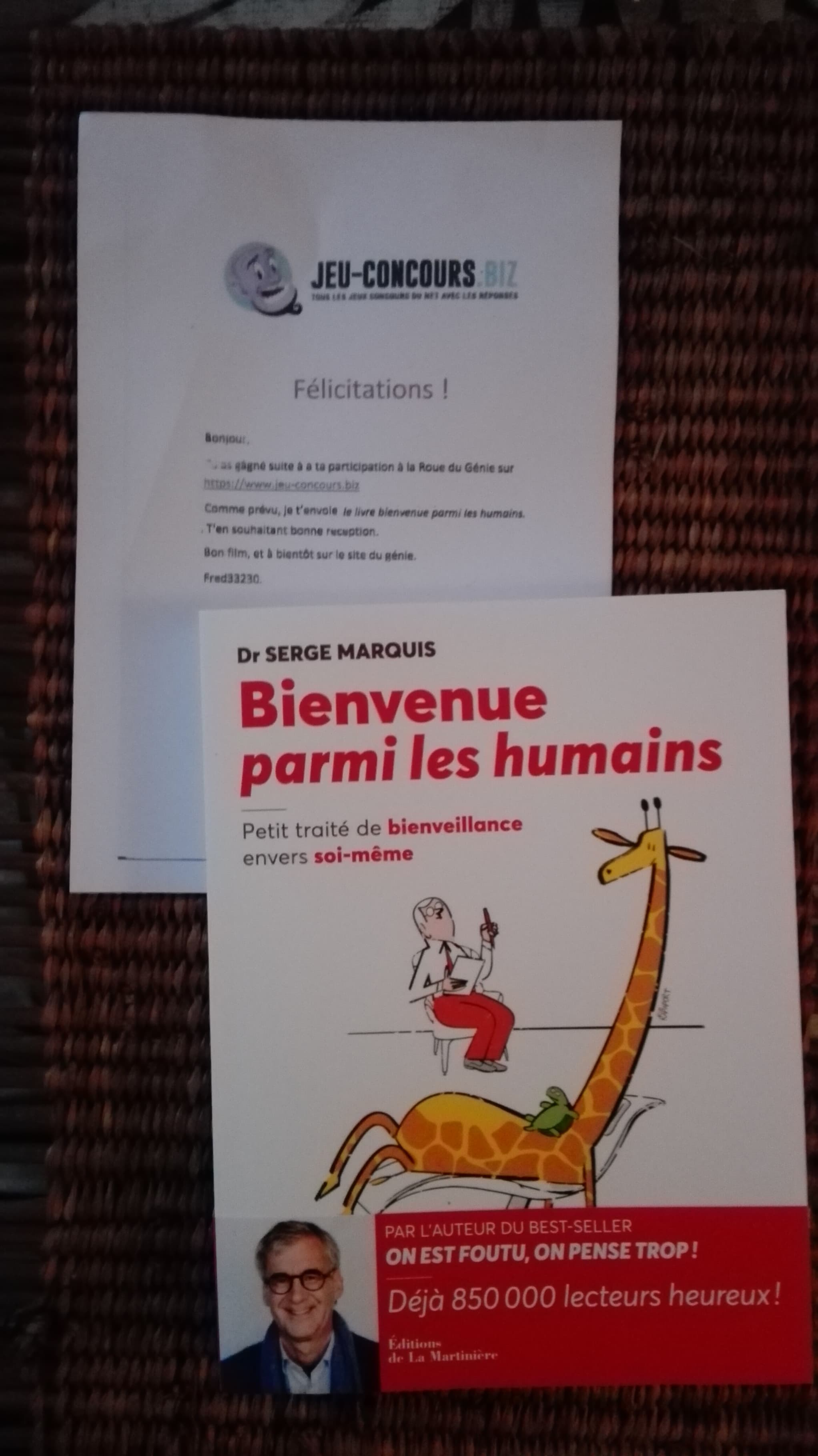 « J'ai gagné un livre "Bienvenue parmi les humains" du Dr Serge Marquis à la roue du Génie grâce à Fred33230. Je suis très heureuse, moi qui suis une grande lectrice et un peu désargentée pour pouvoir m'acheter des livres. Je vous remercie infiniment pour votre générosité