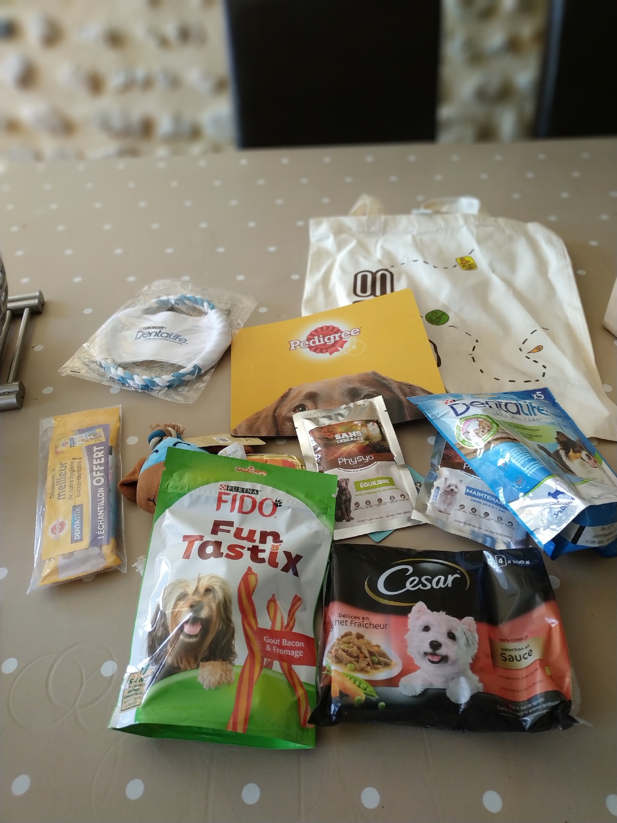 « Merci pour ce lot de friandises, pâtés, et jouets pour chien. Il y avait un sac et un stylo en plus. Je ne sais pas de qui car il n'y avait pas de mot avec. Les chiens et moi sont très contents. »