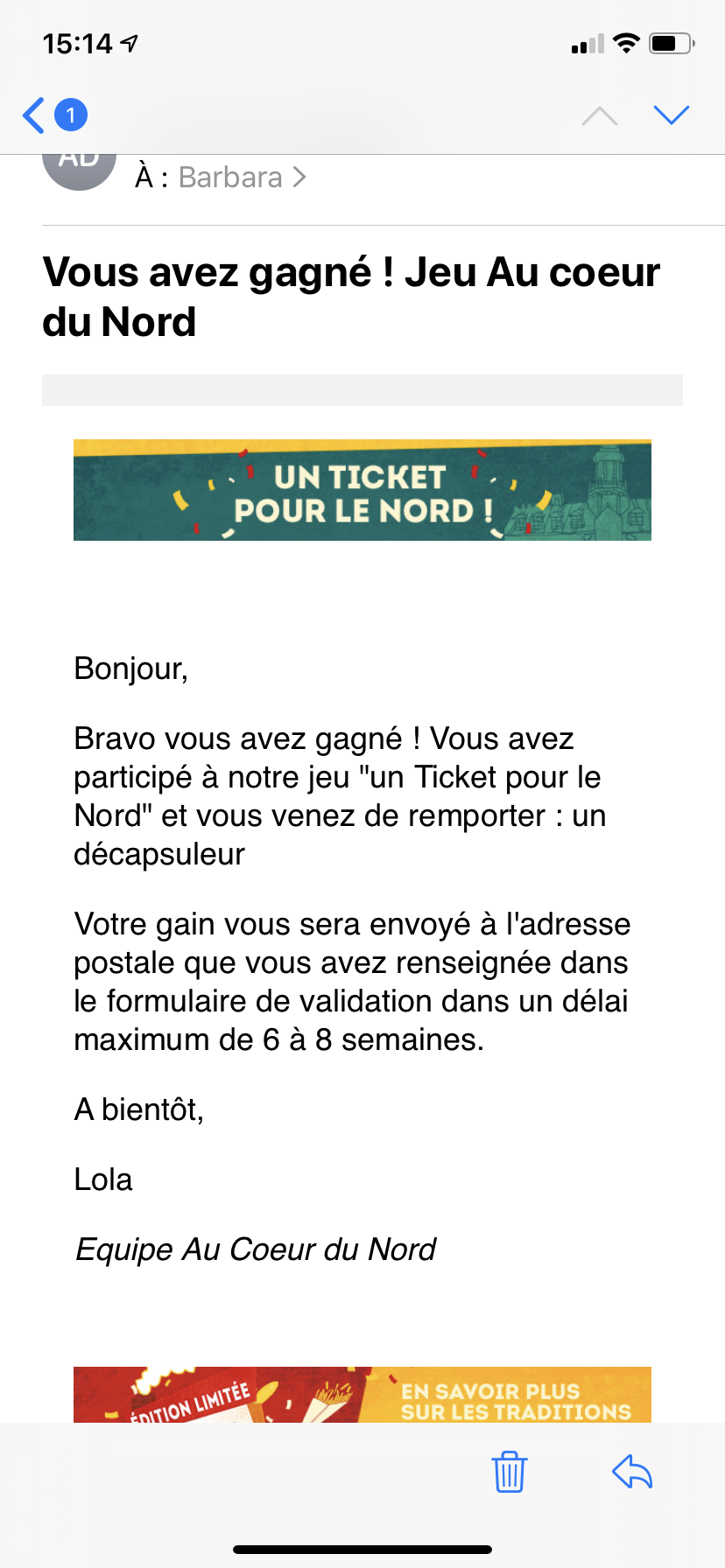 Bravo vous avez gagné ! Vous avez participé à notre jeu "un Ticket pour le Nord" et vous venez de remporter : un décapsuleur »