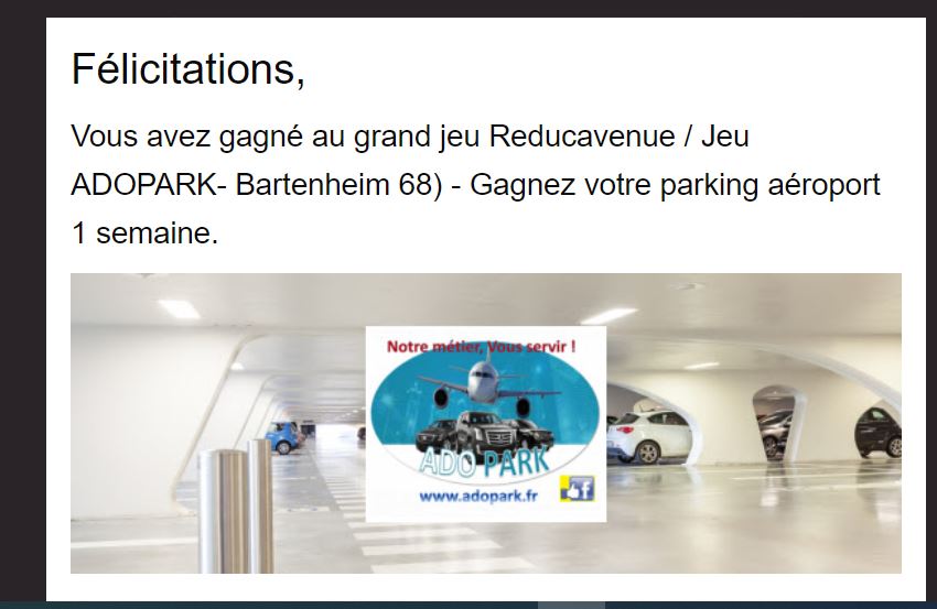 Cadeau gagné : 1 place de parking à 5mn de l'aéroport, durée une semaine + navette d'une valeur unitaire de 100€.