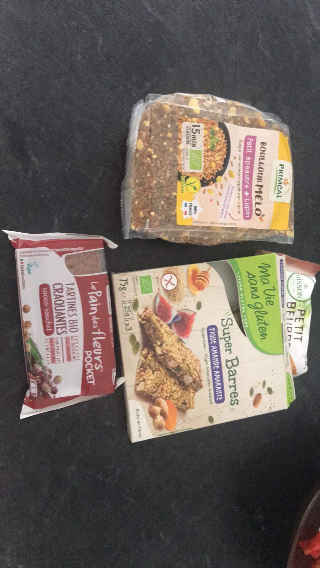 « Un lot d’aliments bio de Ekibio avec des petits beurres, barres céréales, boulgour, et des tartines. »