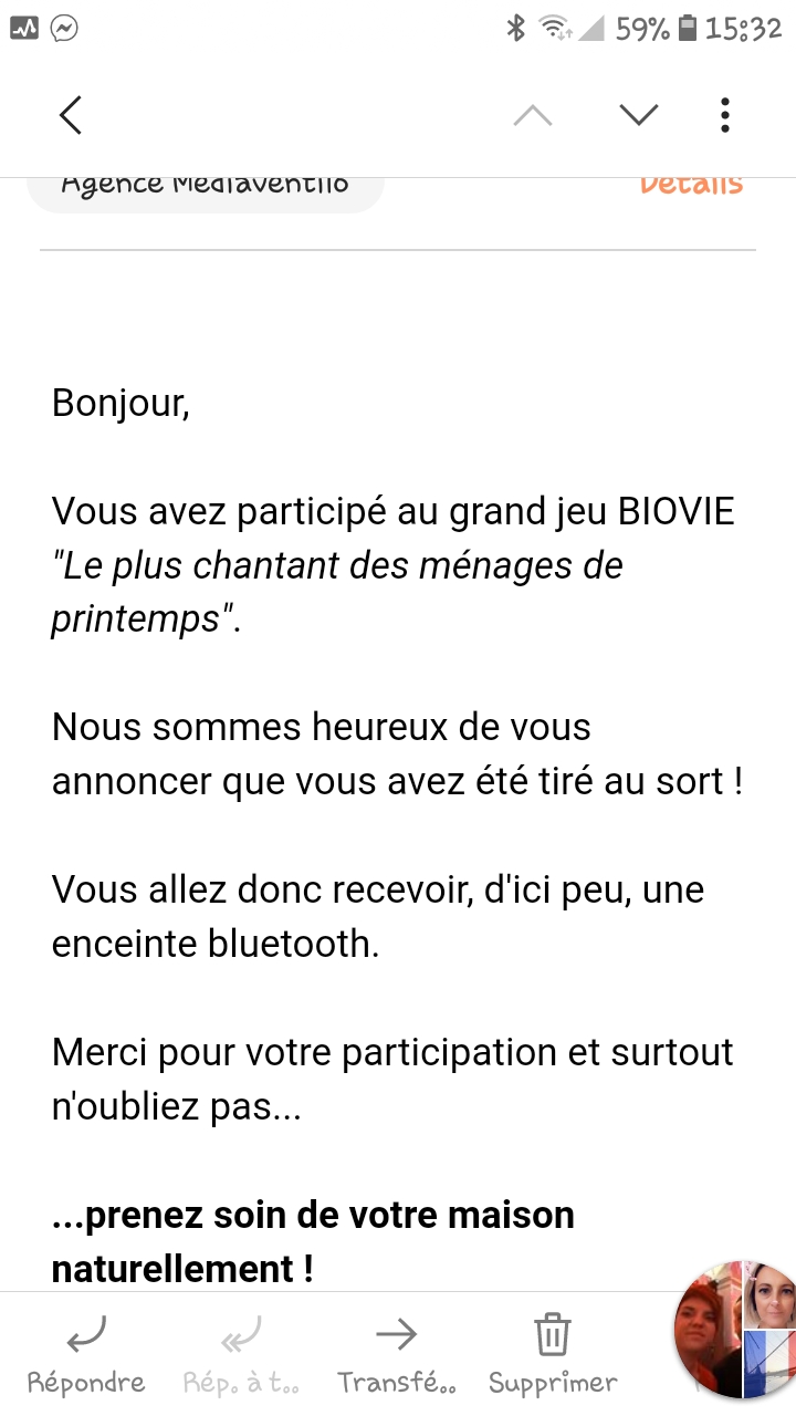 « Reçu un mail à l'instant, j'ai gagné un enceinte bluetooth Mapple en bois au jeu Biovie. Merci le génie. »