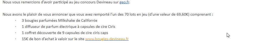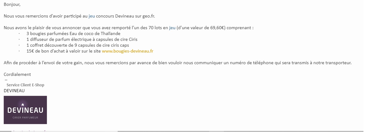Gagné par loulou66670 il y a 5 ans« Objet : Votre participation au jeu Femme Actuelle