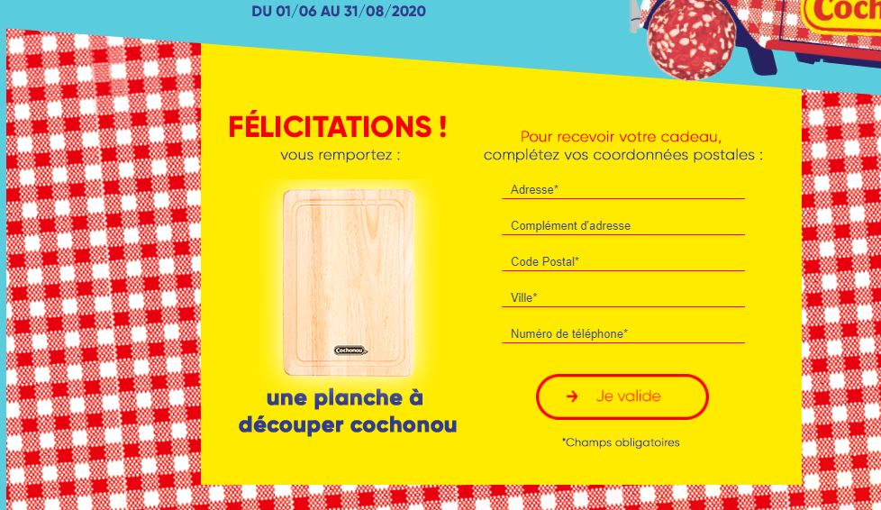 « Bravo! Vous avez gagné un maillot de football de notre belle Equipe de France suite à votre participation au jeu concours en ligne Coca-Cola x Equipe de France 2020. Nous souhaitons vous faire parvenir le maillot de nos Bleus prochainement.