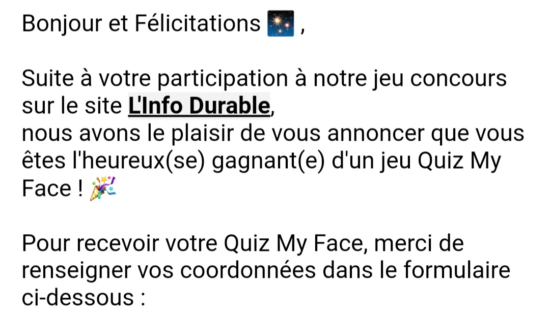 « J'ai gagné le jeu Quizz my face avec Info Durable »