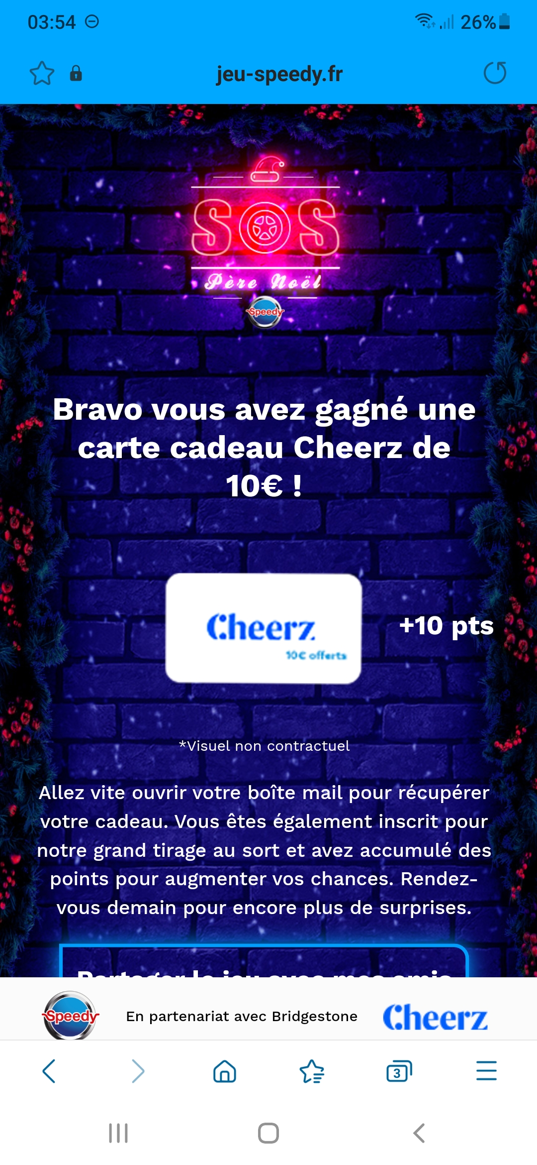 Gagné par Loisel211925 il y a 4 ans« J'ai gagné une carte cadeau Cheerz de 10 euros grâce à Speedy... »