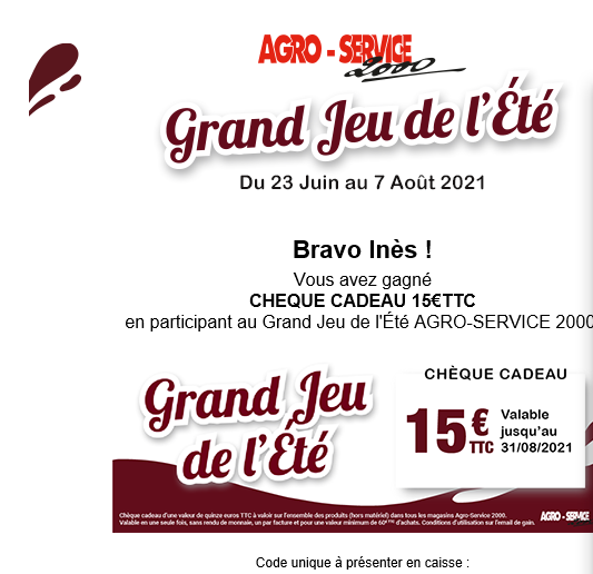 Gagné par manuela13002 il y a 4 ans« Merci au génie ! Ce chèque cadeau est utilisable jusqu'au 31/08 avec un code à présenter en caisse. Cependant, je n'ai aucun magasin Agro Service près de chez moi. Je donnerai donc avec plaisir ces 15 euros à la première personne qui me le demandera ! »