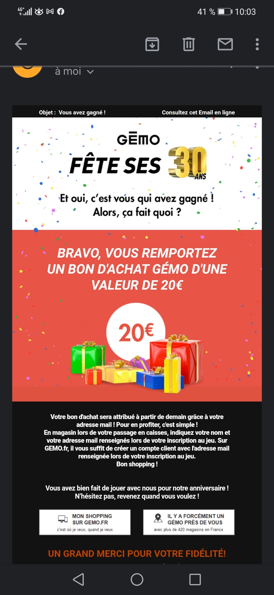 « Gagné aujourd’hui un bon d’achat de 10€ grâce à l’instant gagnant Gémo, c’est ma fille qui va être contente