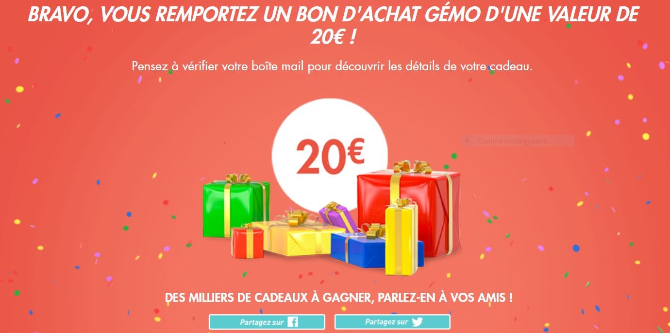 « Au Jeu avec obligation d'achat Gémo un petit bon d'achat de 20 euros...