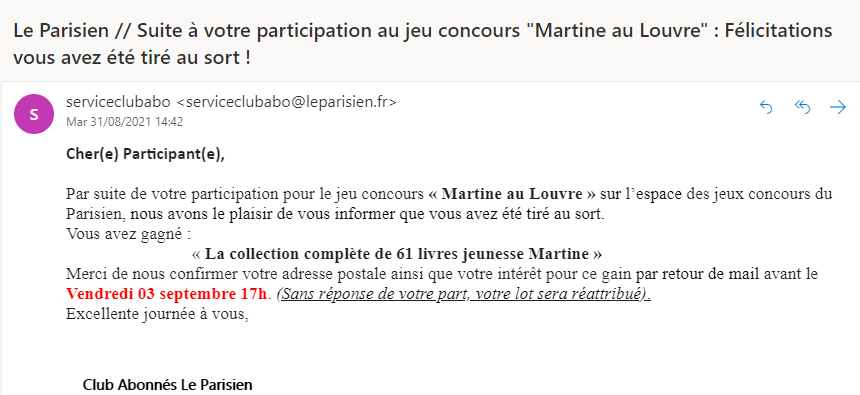 « Mail ce soir (13/08) pour me dire que j'ai gagné 50 € sur Le Colonel