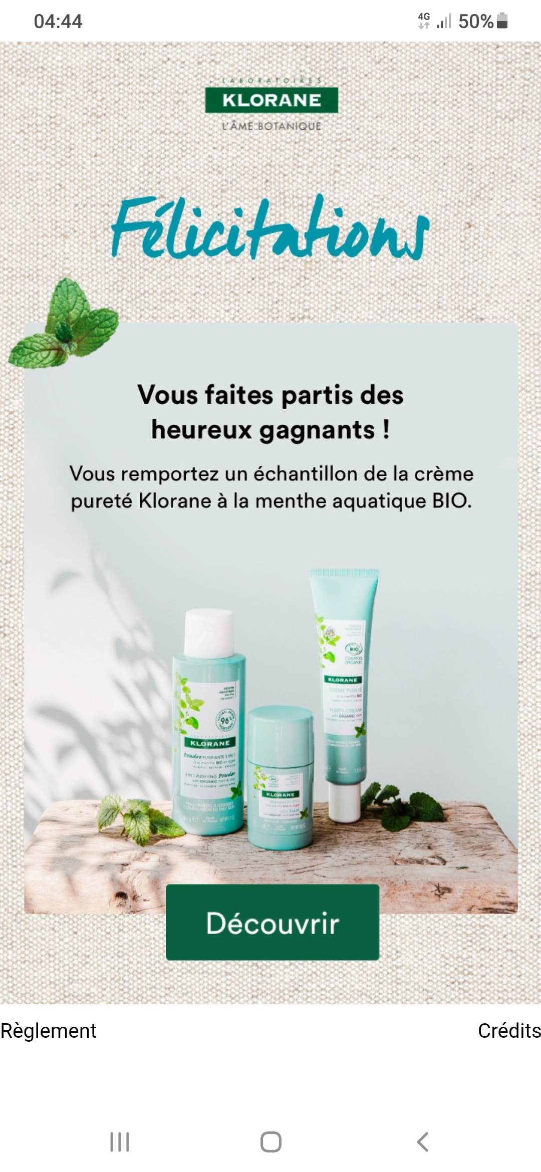 « Je viens de gagner un échantillon de la crème pureté Klorane. »