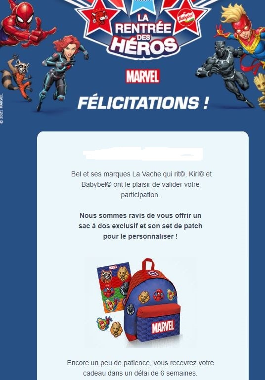 Gagné par Lili2810 il y a 4 ans« Bel et ses marques La Vache qui rit, Kiri et Babybel ont le plaisir de valider votre participation.