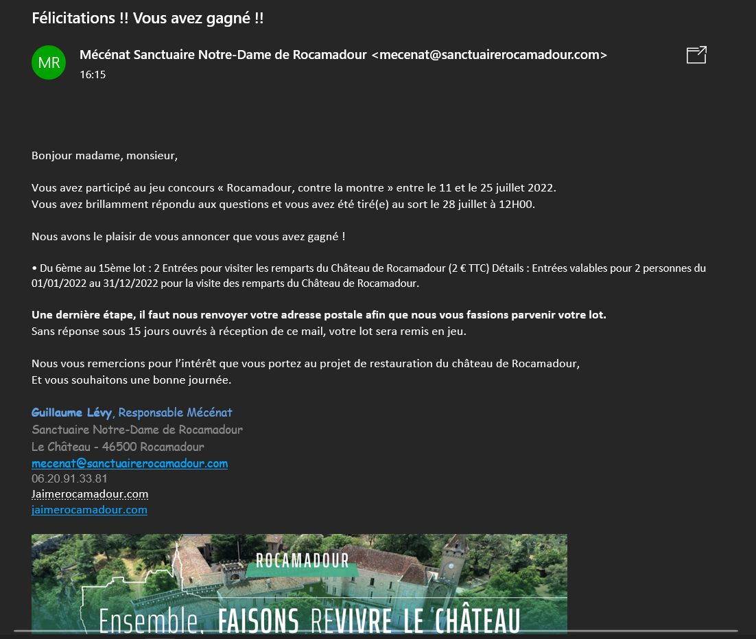 Gagné par Cynthia1000 il y a 3 ans« J'ai gagné 2 entrées pour visiter les remparts du Château de Rocamadour (6ème au 15ème lot) »