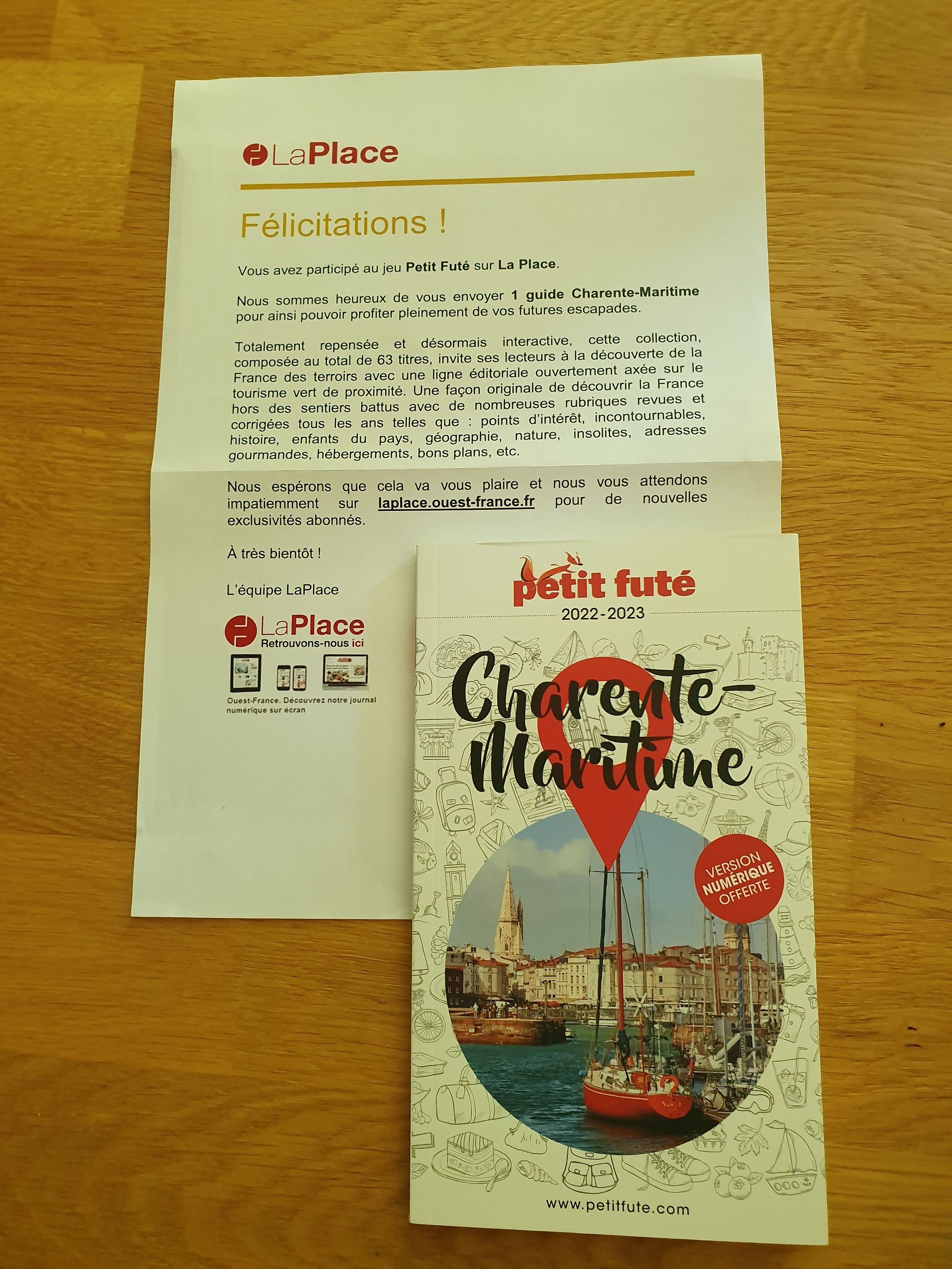 « Reçu ce jour un guide Petit Futé Charente-Maritime gagné au concours Ouest France "La Place" clos le 07/08