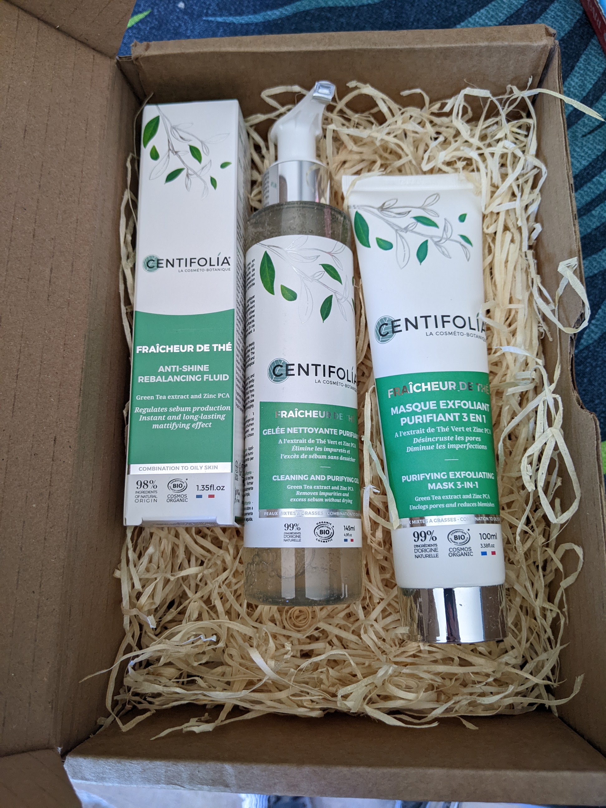 « Reçu ce matin dans ma boîte aux lettres, lot de 3 produits à tester (gelée nettoyante, masque exfoliant, crème matifiante) . Merci au génie, Centifolia et Trustbeauty »