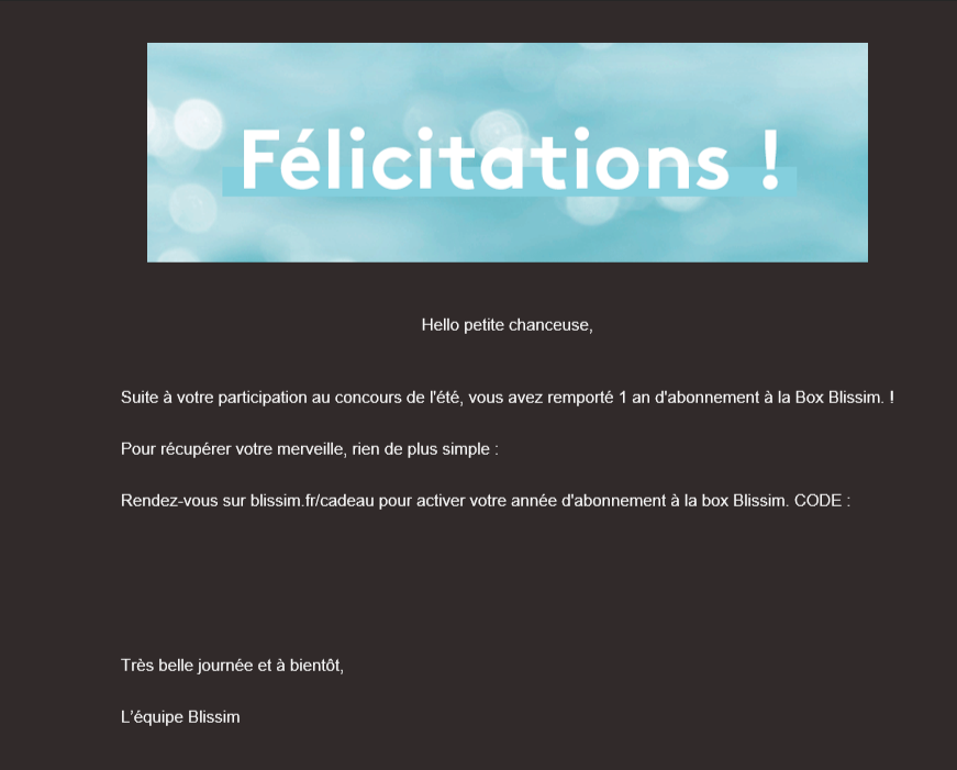 « Gagné un des lots mis en jeu le 05/08 au concours Blissim. 1 an d'abonnement à la box Blissim ! Merci au Génie !! »