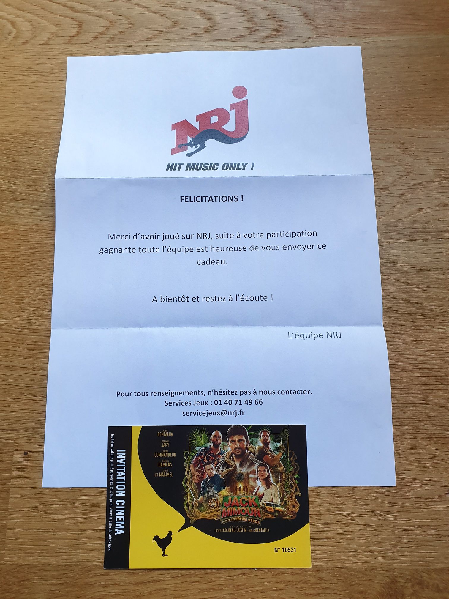 Gagné par jenyfer89 il y a 3 ans« Reçu aujourd'hui une invitation pour 2 personnes pour le film "Jack Mimoun et les secrets de Val Verde" grâce au jeu NRJ clos le 16/10. Je suis contente car c'est le premier gain de ce type et le premier gain avec une station de radio. Merci à NRJ ! »