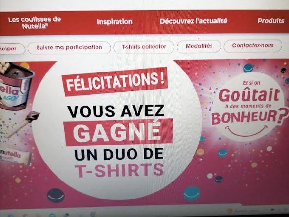 « Reçu ce jour 2 t-shirts Nutella gagnés aux IG !! Merci à eux et au génie. »