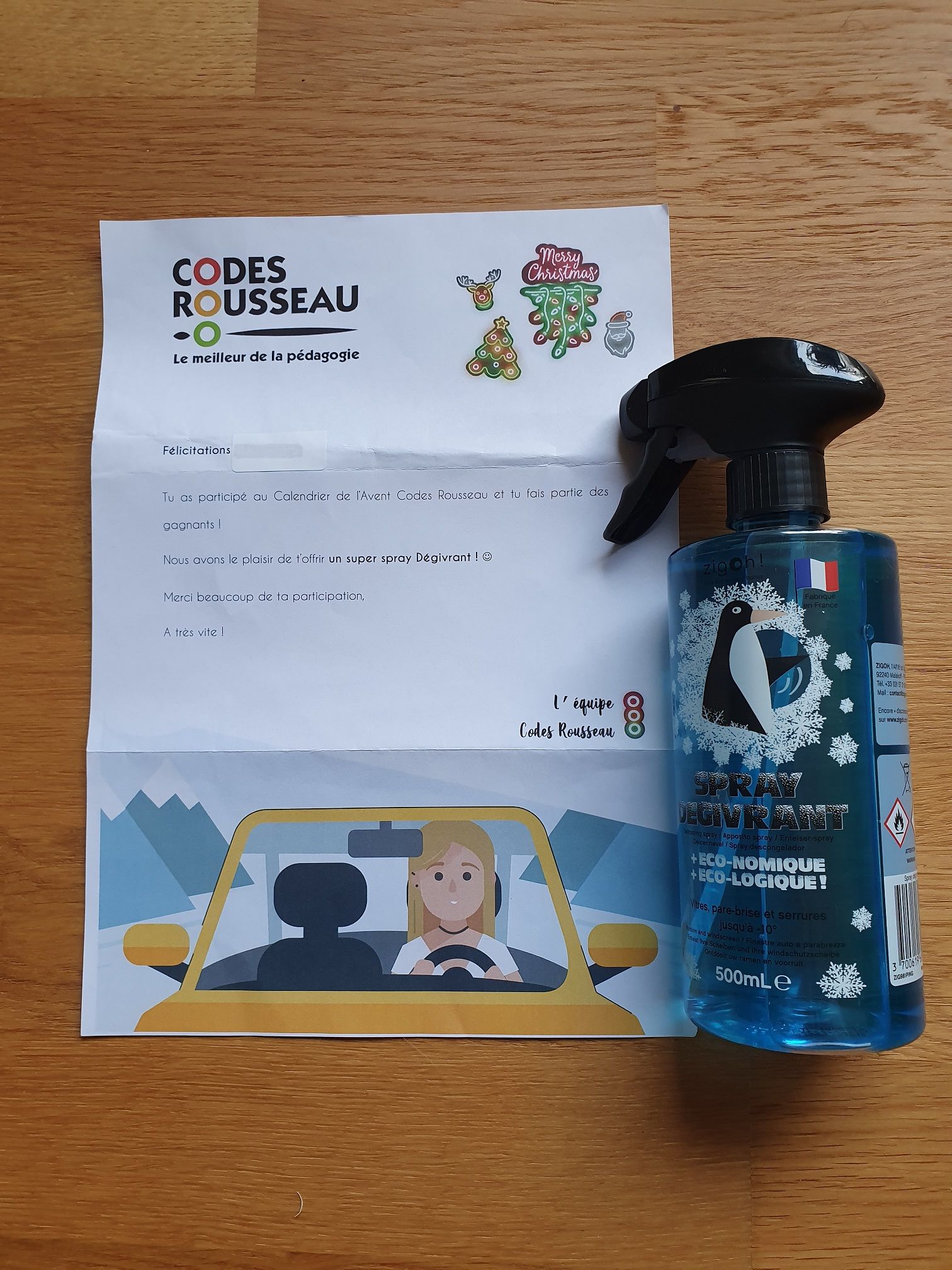 « Au calendrier de l'Avent des Codes Rousseau, gagné un spray dégivrant. Petit cadeau (env 6 €) mais qui peut être utile, je n'ai jamais essayé ce type de produit. Merci aux Codes Rousseau pour ce lot et félicitations pour leur calendrier original