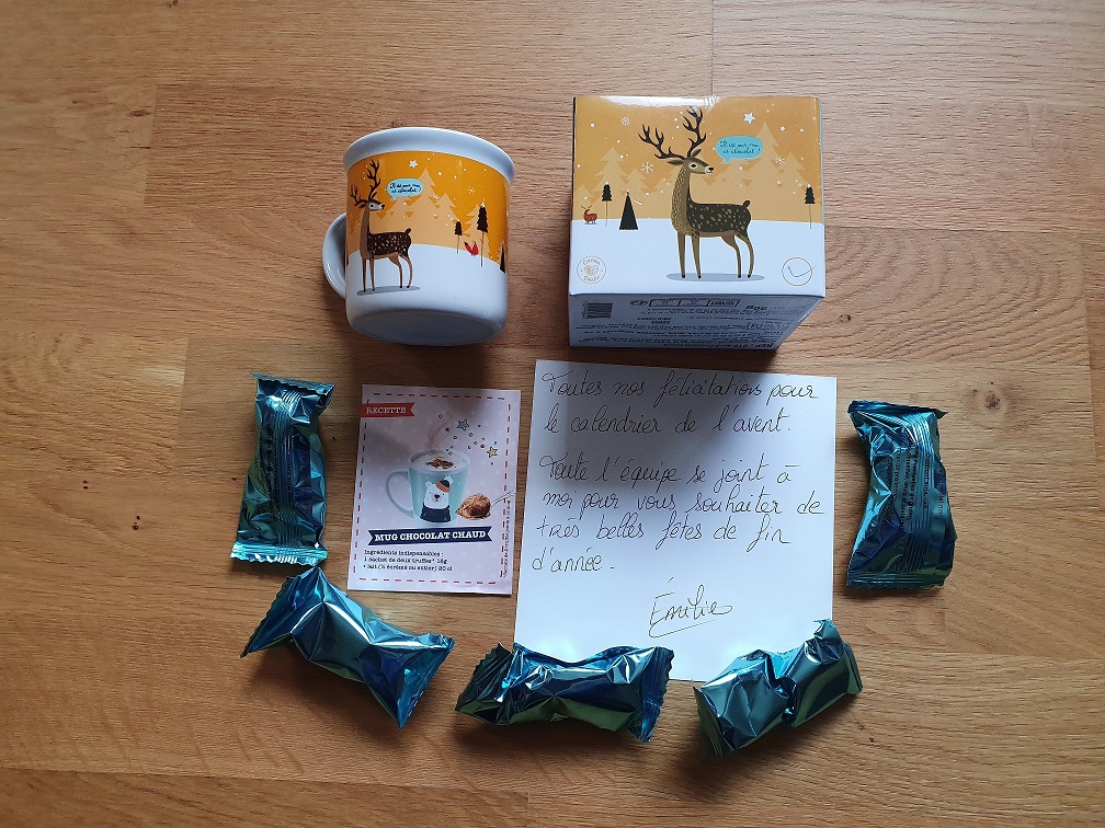 « Au calendrier de l'Avent de Kadodis, gagné un mug avec quelques truffes au chocolat. Sympas la recette du chocolat chaud et le petit mot manuscrit. C'est une entreprise que je ne connaissais pas. Merci à Kadodis pour ce calendrier gourmand