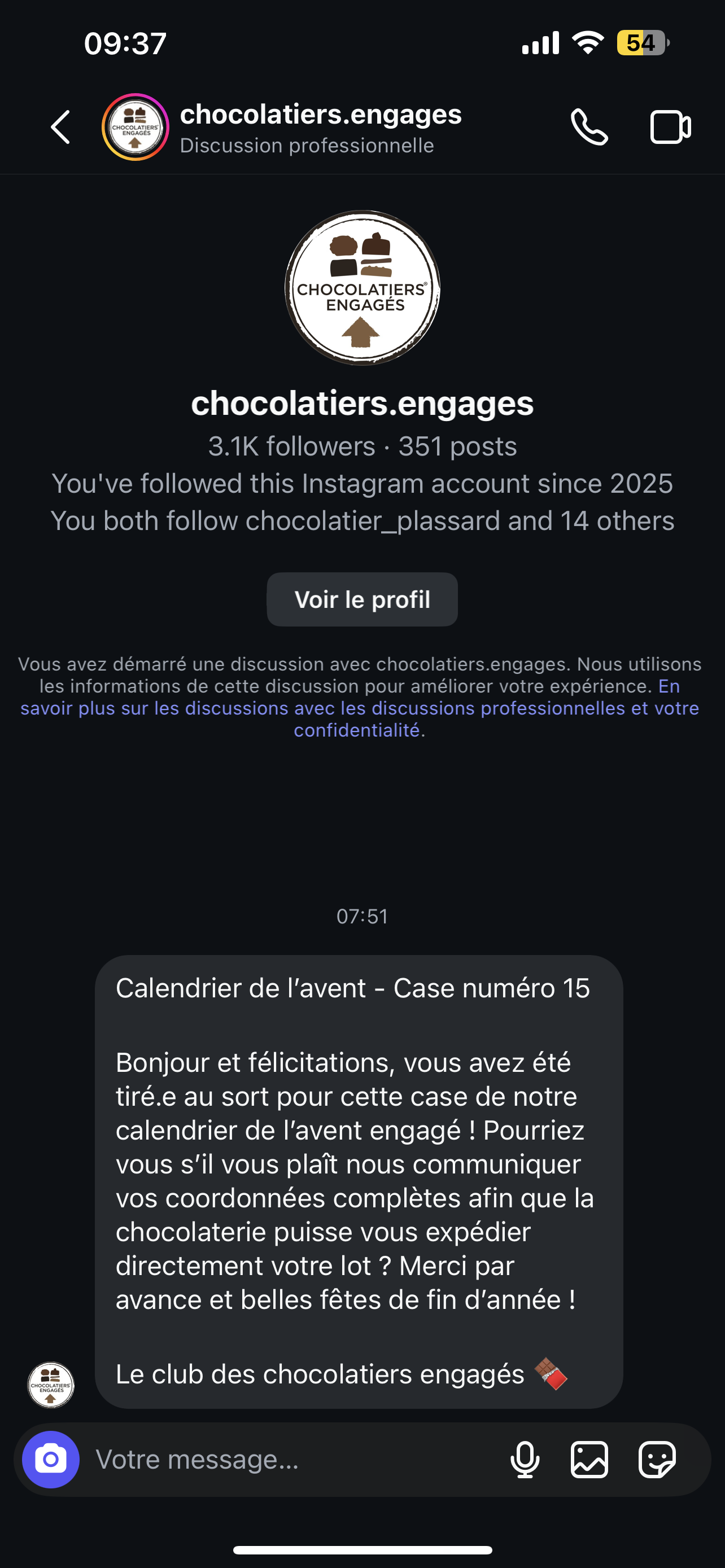Gagné par Sauty il y a 4 j« Gagné à la case 15 du concours calendrier de l’avent chocolatiers engagés sur Instagram