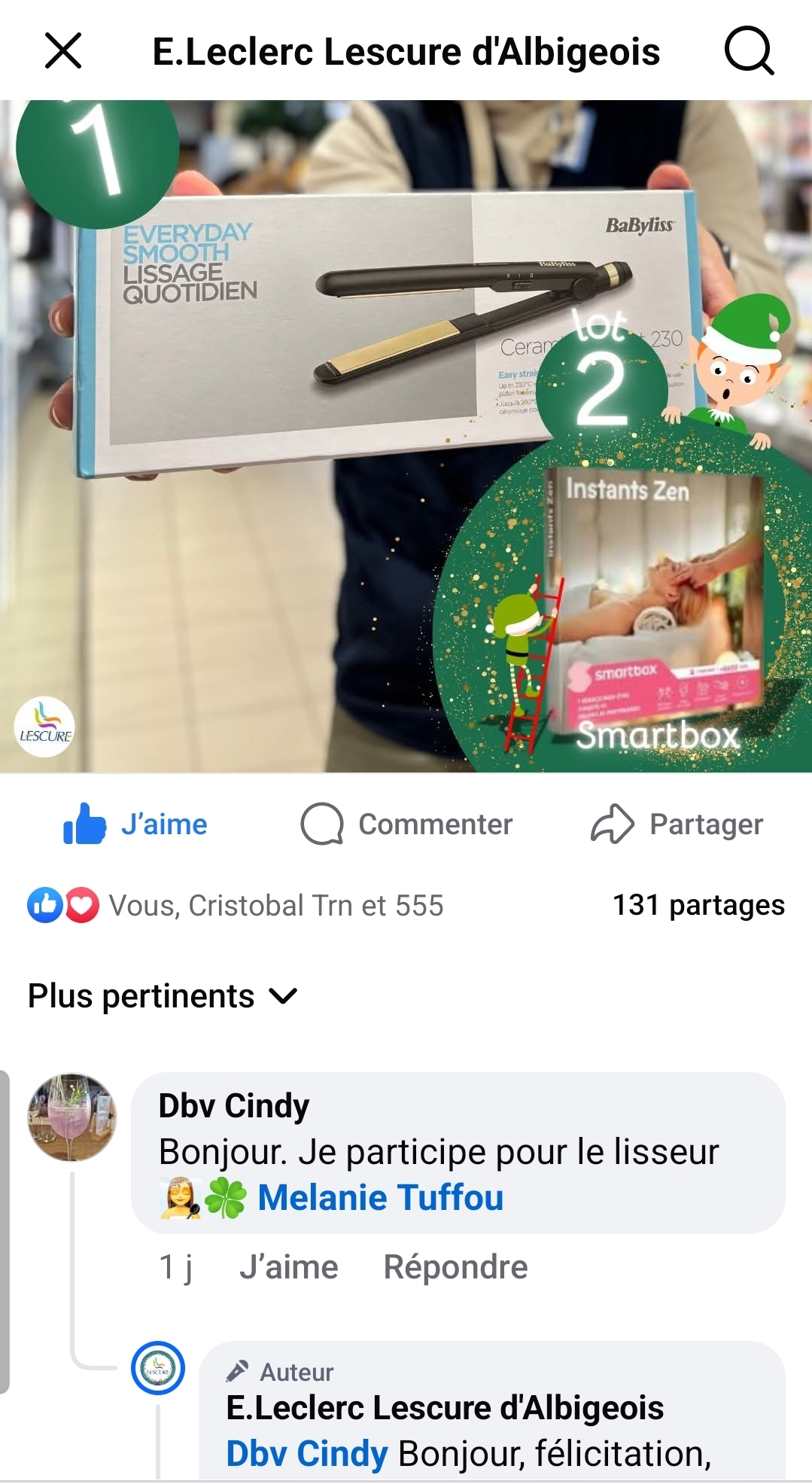 « Gagné un lisseur à cheveux Babyliss avec la case n°2 du calendrier de l'Avent de mon magasin E.Leclerc sur Facebook